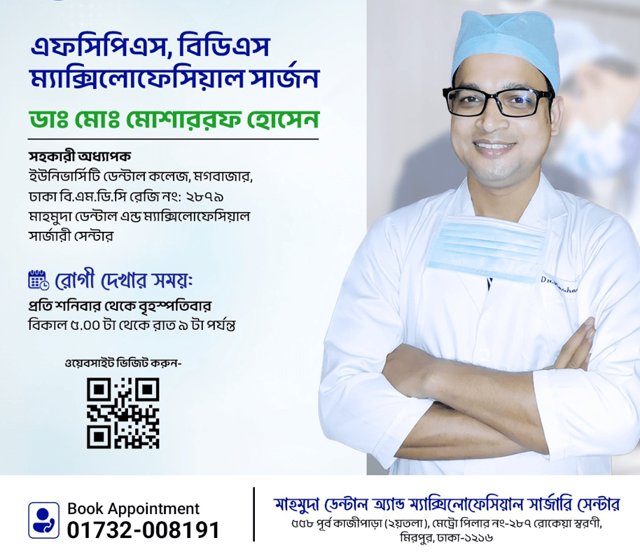 Dr. Md. Mosharraf Hossain, an Oral & Maxillofacial Surgeon and Assistant Professor at University Dental College. With over 15 years of clinical and teaching experience, I am dedicated to providing advanced surgical care, compassionate dental treatment, and mentoring the next generation of dental professionals. Through Mahmuda Dental Clinic & Maxillofacial Surgery Centre, I strive to deliver trusted, patient-focused oral health services.